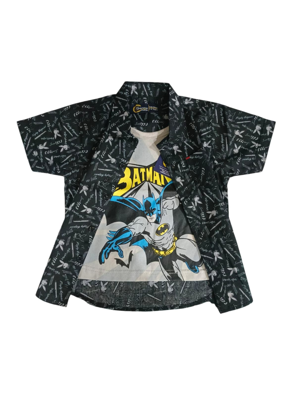 Step into the shadows with this Black Printed Double Shirt with Batman T-Shirt, combining a sleek black printed overshirt with an iconic Batman graphic tee for the ultimate hero-inspired streetwear combo. Perfect for night-time crusaders and daytime style vigilantes.