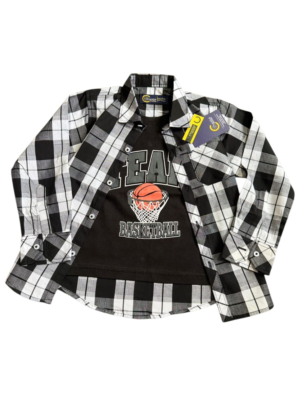 Style meets comfort with our Boys' Black & White Double Layer Shirt — the perfect blend of modern streetwear and everyday versatility. Featuring a unique double-layered design, this shirt combines a crisp white inner layer with a classic black outer shirt, giving the illusion of two shirts in one.