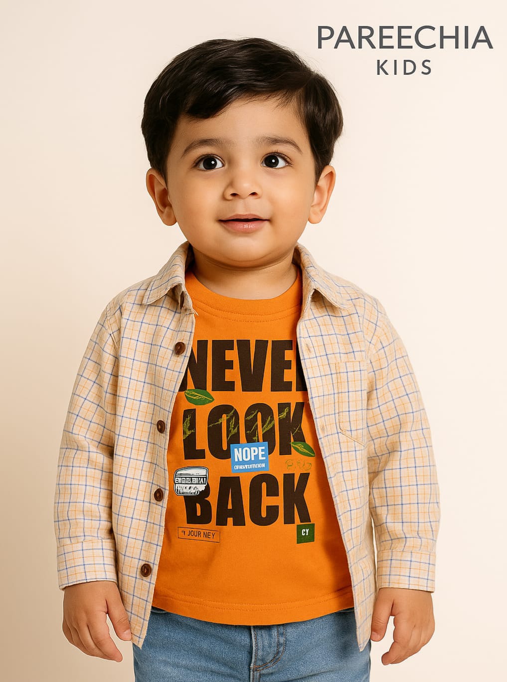 Add a pop of playful style to your little one's wardrobe with this trendy orange and off-white checked double-layer shirt for boys. Designed for kids aged 1 to 12 years, this shirt features a stylish checkered outer layer with a soft inner T-shirt look, giving the appearance of two shirts in one – perfect for both casual outings and special occasions.